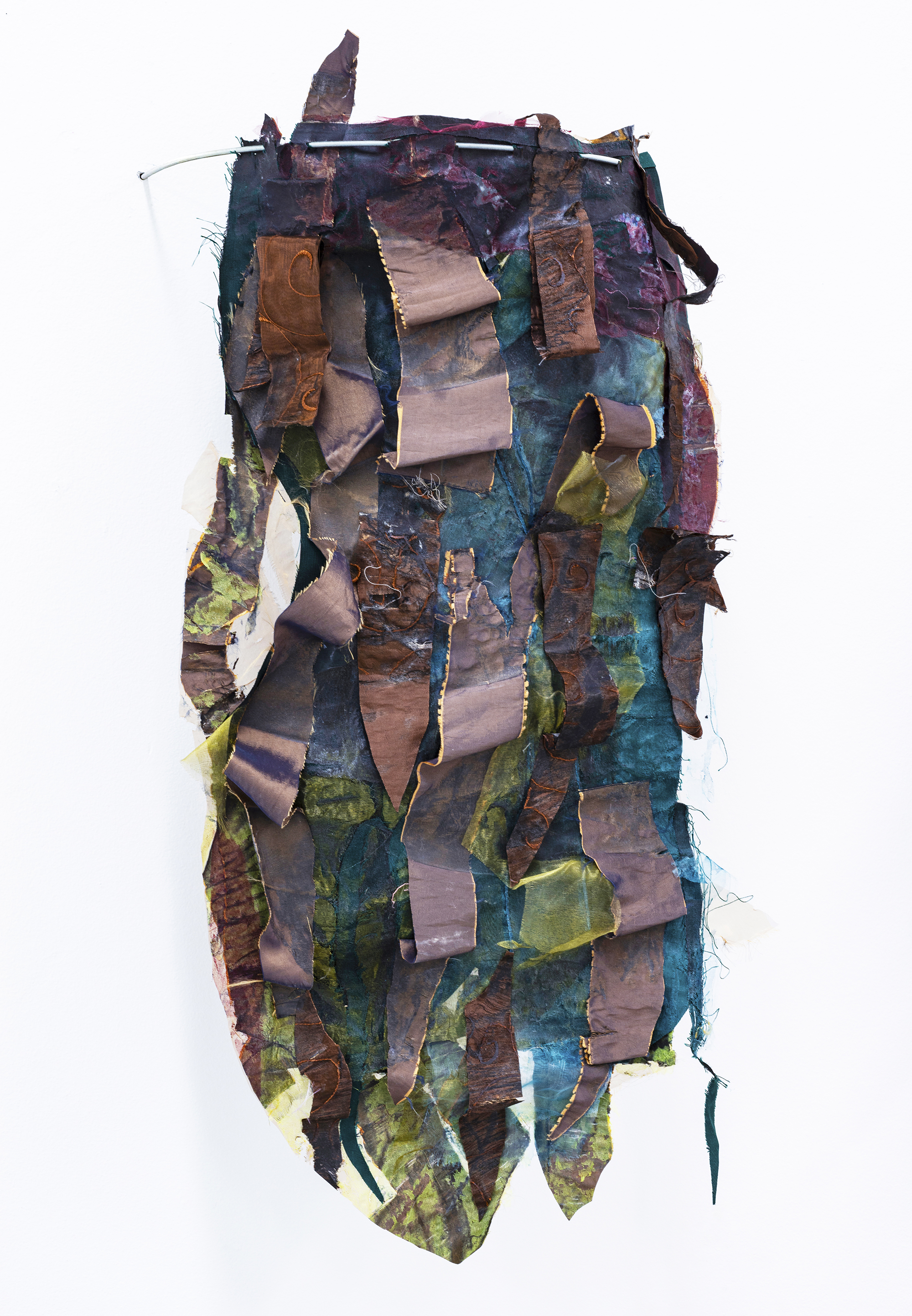 Textile twinned around its own axis. Threads of metal twined around sticks of steel. 47 million years means nothing to butterflies. Domestic, silk, moth. Thin, strong, shiny. Synthetic and regenerated fibres which soften under heat, melts together and fixates into form when cooled down. Like the spring in a clothing pin, holding onto textiles fluttering like flags in the wind. Cato forced cold sticks of steel through smooth silk, throwing spears in crisp tulle. Cato carefully caressed all the world's potential, melting it into shapes. Water abandoning iron, liquid flowing from stones. Tributes to ancient times, a prayer for rain. Torn pieces of garments made for parties layered on top of one another, seeking each other out and turning into concave and convex shapes. A semicircle closed and open. A shield against the world, a net to catch her. This as well comes from the pure, innocent soil. Polyester sweeping like skin over leaves and stems of plants. Cuticle, a membrane protecting the plant against its own water leaving. Cuticle, one of the most resistant parts of the plant, preserved within fossils. Like little Ida, with baby teeth intact. As fossils slowly become hydrocarbon, in 47 million years being converted into oil, vinyl or perhaps shoulder pads of polyester. Synthetic and regenerated fibres soften when heated, melts together and stiffens when cooled. Everything made in this world is made by what is in her. Degradable, ecologic, natural colour.